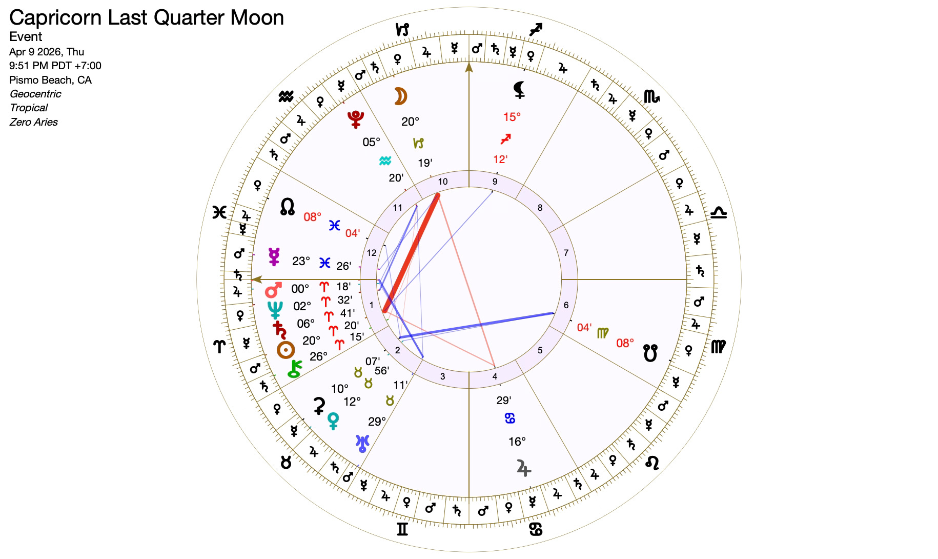The square between the Sun in Aries and the Moon in Capricorn is what creates the Last Quarter Moon. A waning Moon is a time of letting go, and in some cases cutting your losses. Luna is melancholy in Capricorn, technically considered to be in detriment. Translation — it’s not the Moon’s favorite place to be! Capricorn is not known for feelings, and the Moon’s transit through chilly Capricorn may be a challenging one, especially with Saturn’s difficulties in Aries.